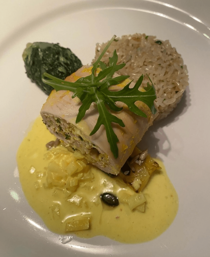Rollade van kalkoen (vulling dilea smeltkaas lactosevrij), paksoi, gebakken ananas, geurige zilvervliesrijst en homemade kerriesausje.