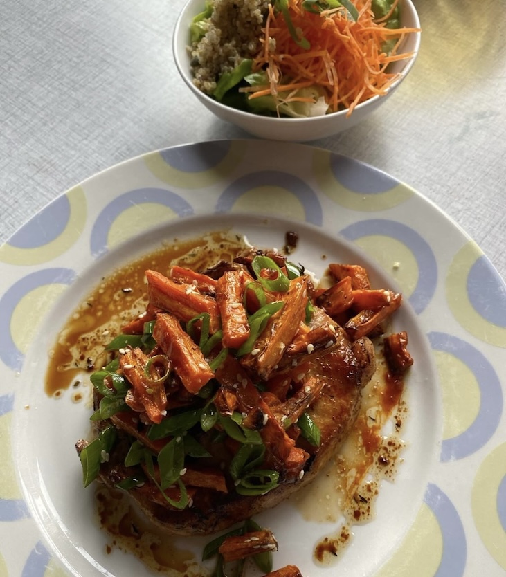 Om 18 uur: mignonette varkenslapje in tijmboter, met airfryer gegaarde worteltjes op smaak gebracht met sesam, olijfolie, peper, fleur de sel en groen van pijpajuin (het wit van de pijpajuin mag je niet eten, net zomin als gewone ui). De gegaarde worteltjes heb ik vervangen door koude wortelen, omdat ik niet graag warme wortels eet (sorry Dries).