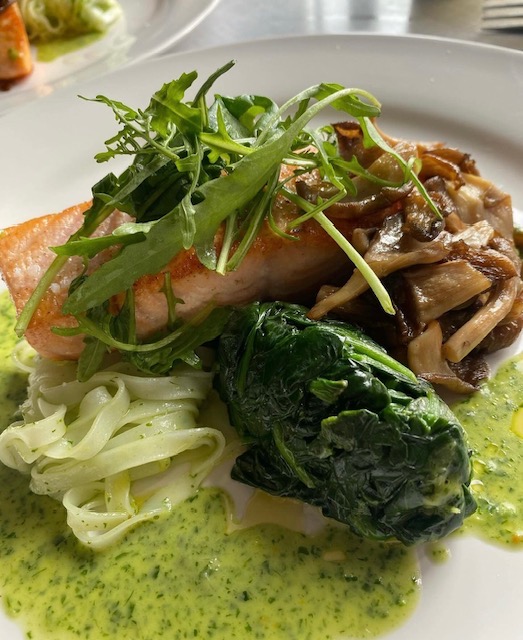 Om 18 uur: zalmfilet kort gebakken, spinazie met Dilea smeerkaas, oesterzwammen, rijstnoedels en pesto van rucola en sinaasappel (handvol rucola opmixen met 1/2 dl koolzaadolie en sap halve sinaasappel, afkruiden peper van de molen en fleur de sel, beetje best van sinaasappel.