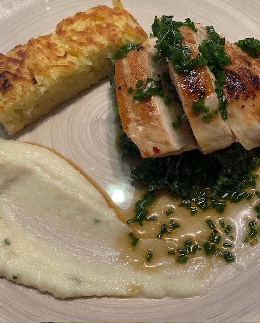 Om 18.30 uur: gegrilde kippenfilet, zalf van pastinaak, boerenkool en aardappeltaartje. Sausje: lauwe vinaigrette op basis van olijfolie, rijstazijn, peper van de molen, enkele druppels ketjap en fijngesneden bieslook.