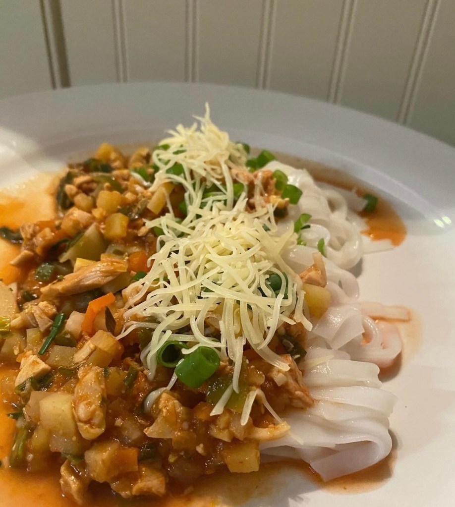 Donderdag waren het rijstnoedels met een saus van brunoise wortel, aardappel, koolrabi, palmhart en kip (verwerkte restjes), afgewerkt met een lepel tomatenpuree en smeltkaas Delia lactosevrij.