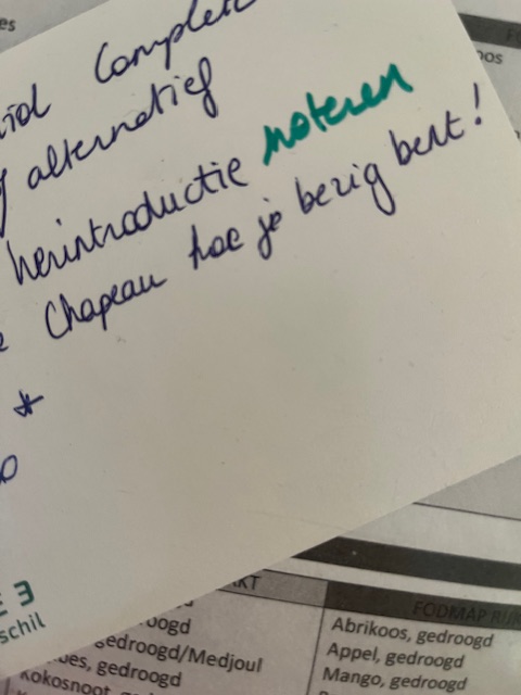Ik blij, de diëtiste ook blij. Ik kreeg zelfs een complimentje dat ik goed bezig was, en toen ik thuiskwam zag ik datzelfde complimentje op het kaartje staan die ze met me meegaf. Een steuntje in de rug is altijd plezant en zorgt ervoor dat je iets volhoudt. Het kwam ter sprake dat ik het voordoe alsof het een makkelijk dieet is, terwijl het dat eigenlijk niet is. En dat klopt wel, maar ik hou in mijn achterhoofd dat ik het slechts eenmaal moet volhouden en ik dan eindelijk weet waarvan ik buikklachten krijg.